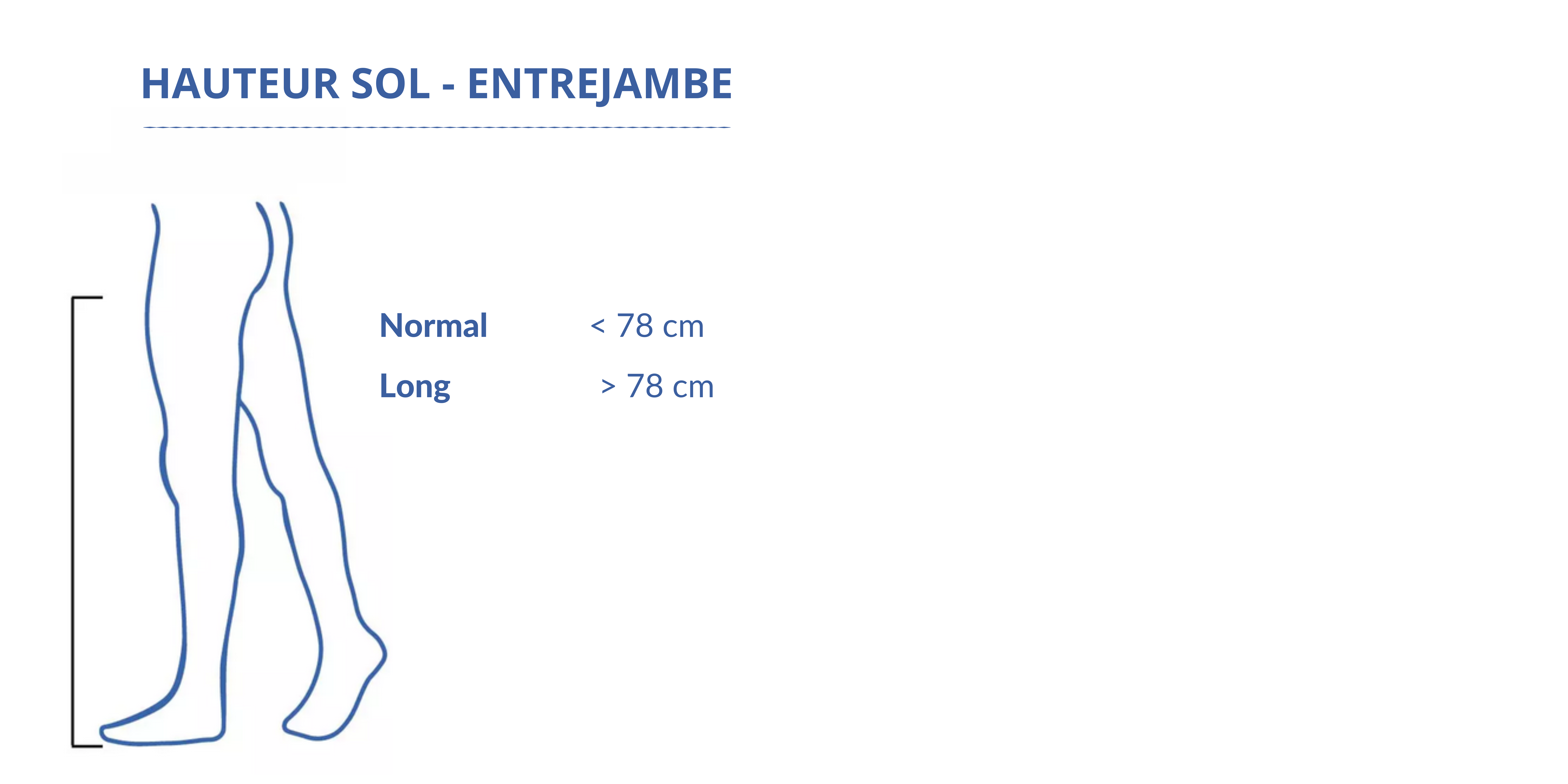Pour mesurer la hauteur des jambes, il faut bien prendre la mesure du sol jusqu'à l'entrejambe.