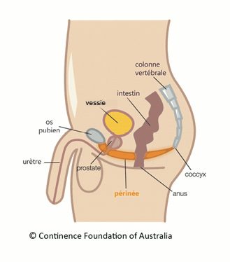 Le périnée est une zone musculaire située entre les cuisses, à l'avant du rectum et de la prostate. C’est un ensemble de muscles qui soutient les organes pelviens, notamment la vessie, la prostate et le rectum. Le périnée joue un rôle important dans la continence urinaire et fécale, un périnée fort et sain peut aider à prévenir les fuites urinaires et l'incontinence fécale. De même, il joue un rôle dans la fonction sexuelle, comme dans les troubles de l'érection. C’est pour cela qu’il est important de ne pas le négliger. Schéma du périnée chez l'homme :