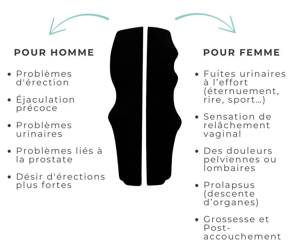 La rééducation périnéale s'adresse aussi bien aux femmes qu'aux hommes. Elle vise à prévenir ou traiter divers troubles liés à un affaiblissement du plancher pelvien, comme :Chez les femmes : incontinence urinaire à l’effort (toux, rire, sport), sensation de relâchement vaginal, douleurs pelviennes ou lombaires, prolapsus d’organes (descente d’organes)Chez les hommes : troubles érectiles, éjaculation précoce, problèmes urinaires, complications liées à la prostate (hypertrophie ou chirurgie)Une rééducation efficace améliore le contrôle urinaire, les fonctions sexuelles, et contribue au bien-être général.