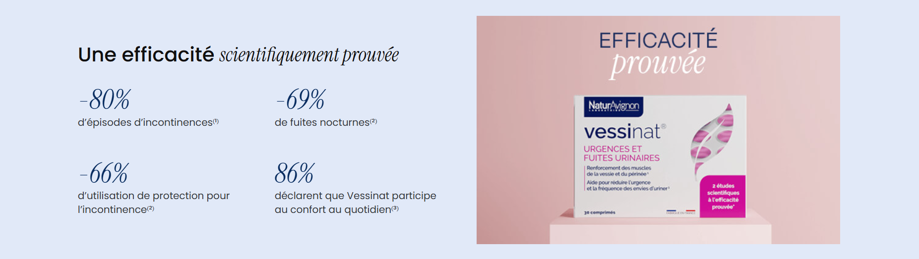 Le complément alimentaire Vessinat a été spécialement formulé pour lutter contre toutes les fuites urinaires d'effort ou d'urgence.