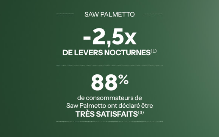 Une formule élaborée à partir d’un extrait de haute qualité, provenant de Floride et particulièrement riche en acides gras pour une efficacité optimale. Grâce à ses ingrédients approuvés par l'OMS⁽²⁾ et à une méthode d’extraction préservant l’ensemble de ses qualités nutritionnelles, Saw Palmetto permet de réduire les réveils nocturnes de 2,5 fois.⁽¹⁾