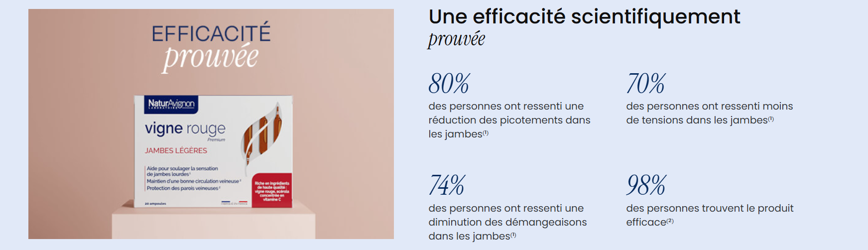 Le complément alimentaire vigne rouge de la marque NaturAvignon permet de diminuer les sensations de jambes lourdes.