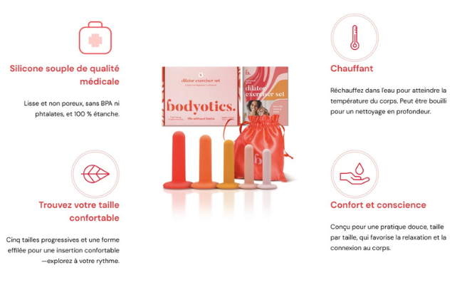 Conçu pour vous accompagner en douceur, le set de dilatateurs Bodyotics est la solution idéale pour soulager les douleurs pelviennes et apprivoiser votre corps.