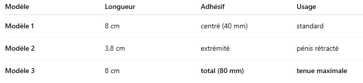 C’est un étui pénien externe standard, mais avec une particularité clé : son adhésif se trouve sur toute la longueur de l’étui